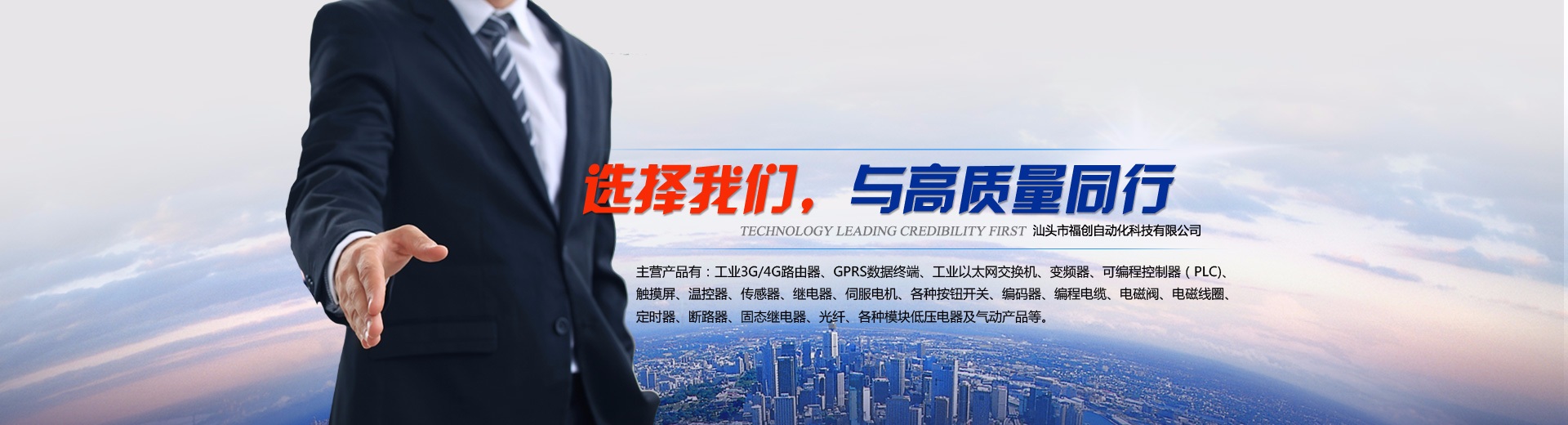 汕頭市福創自動化科技有限公司是一家集自動化元件的代理銷售與維修、自動化設備設計制造、自動化工程安裝改造、機電工程安裝改造、自動化機械設備設計與制造的企業?! ≈鳡I產品有:工業3G/4G路由器、GPRS數據終端、工業以太網交換機、變頻器、可編程控制器(PLC)、觸摸屏、溫控器、傳感器、繼電器、伺服電機、各種按鈕開關、編碼器、編程電纜、電磁閥、電磁線圈、定時器、斷路器、固態繼電器、光纖、各種模塊低壓電器及氣動產品等。